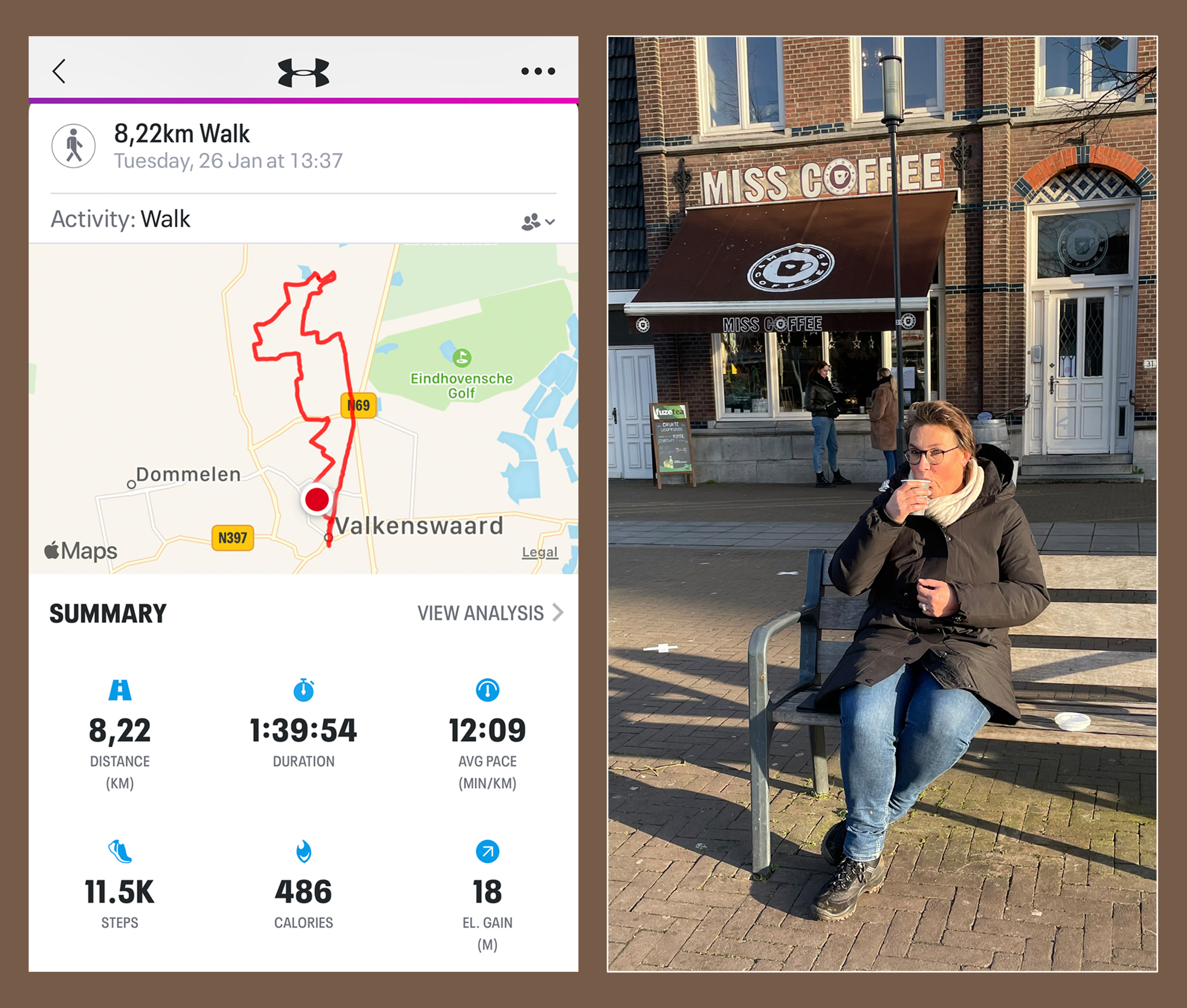 wandelen en een coffee-to-go en zwaaien naar mijn wel werkende collega’s!