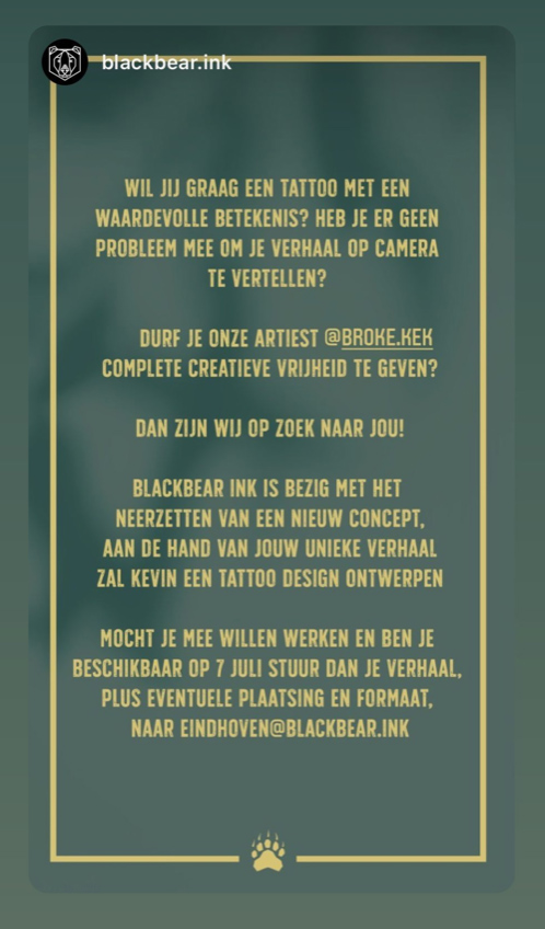 Mijn verhaal heeft bij BlackBear Ink wél indruk gemaakt en ze hebben me geselecteerd! 😁 Heel spannend, ook soort van “de controle loslaten” en hopen dat Kevin een tattoo ontwerpt die bij mijn verhaal past én ik zelf ook mooi vind! Geen verschrikkelijke versie van: Just Tattoo of Us… 😬
