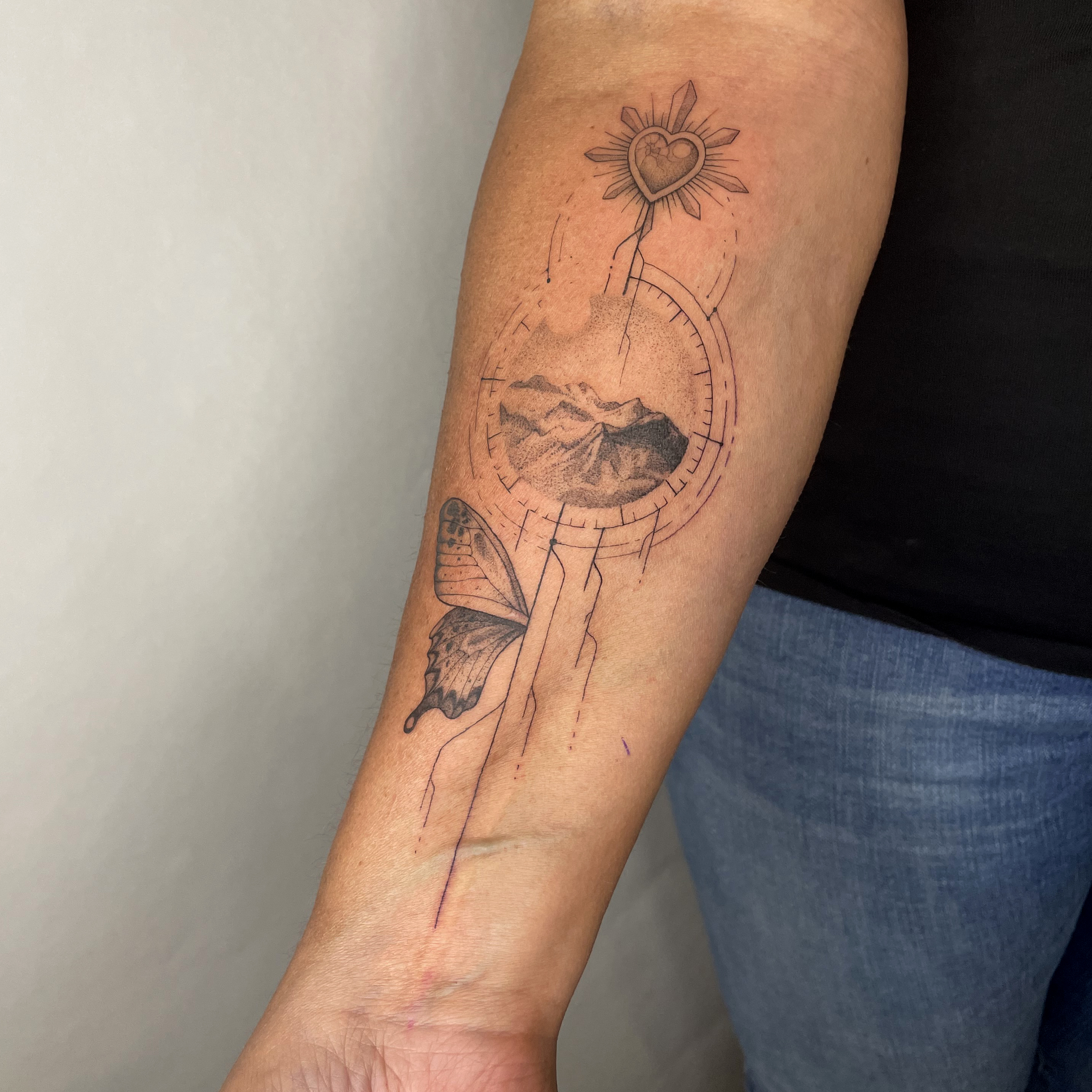 Bovenaan staat mijn hart, dat klopt en blijf ondanks alles krachtig én shinen. De dikke rand van het hart is om mijn grenzen te bewaken (burn-out). Het rondje in het hart is de borst die ik nog wél heb en de grillige strepen in het hart, staan voor mijn “leeftekens”. De bergen staan voor de pieken en dalen in mijn leven, met wat mistige onzekerheden, maar met de krachtige zon erboven. De wijzerplaat eromheen staat voor de tijd, verleden, heden én toekomst, hoogtijd om te gaan puberen! De halve vlinder om er steeds in te blijven geloven, dat ik ooit een mooie vlinder zal zijn, door de groei/vooruitgang en het positieve te blijven zien. Prachtig toch? ☀️🦋😊