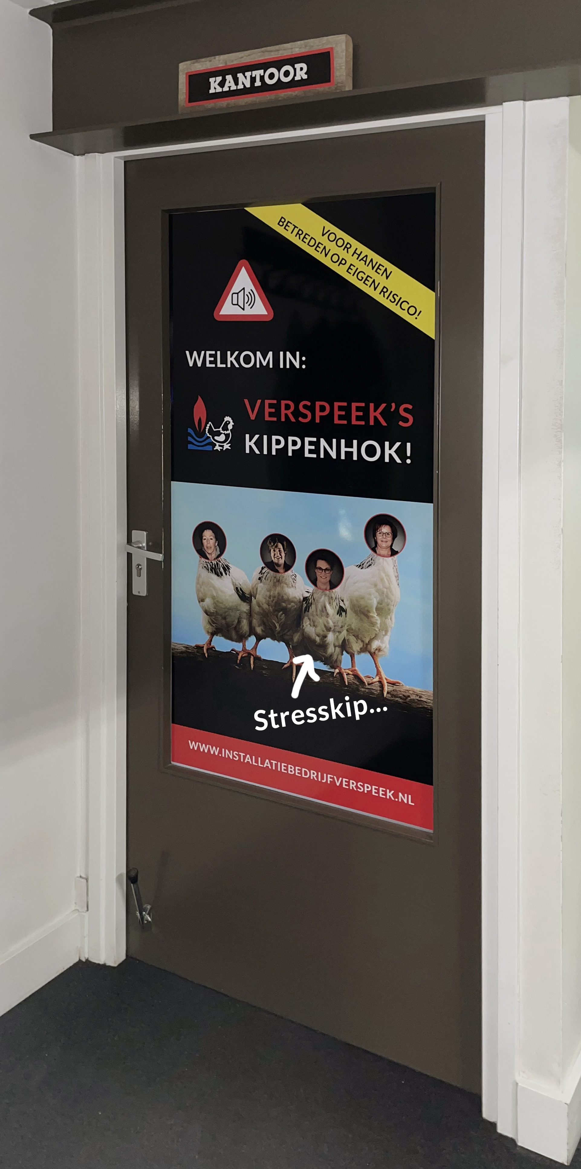 Op ons werk hebben we naar de deur naar het kantoor een afbeelding van “Verspeek’s kippenhok” met foto’s van de goeivrouwkes als kippetjes. Het kan er soms nogal luidruchtig aan toe gaan, haha! Bij mijn foto moet dan eigenlijk nog “stresskip” onder staan. 😜